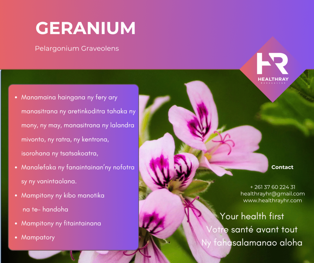 - Favorise l’élimination des sucres et des amidons dans le sang, L’huile essentielle de géranium est spécialement recommandée aux soins de l’épiderme. C’est un régénérant cutané, applicable aux cicatrices ou aux mycoses de la peau, de l’appareil digestif (candidoses). On lui prête aussi un intérêt contre le diabète pour son action est purifiante.