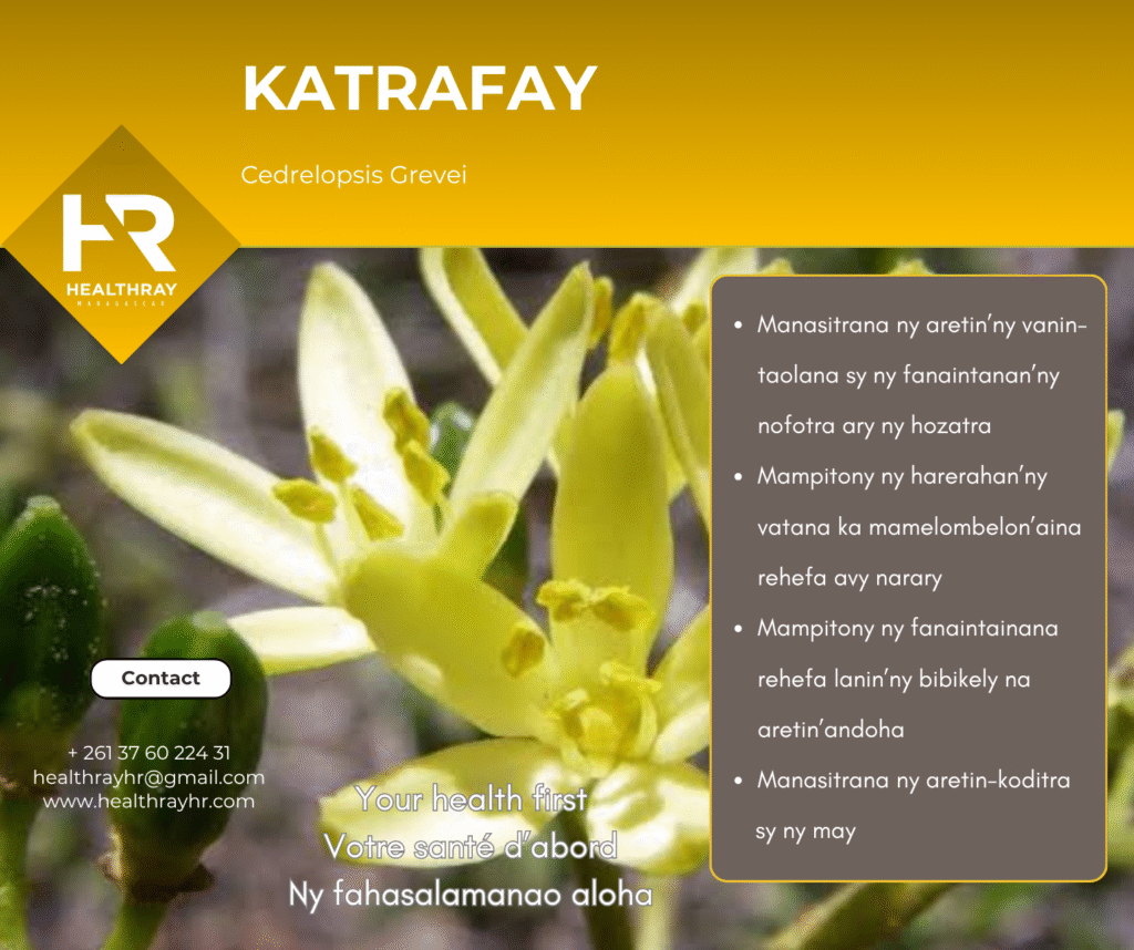 L’huile essentielle de Katrafay possède des propriétés anti-inflammatoires, tonifiantes et antalgiques. Elle est utilisée pour soulager les douleurs articulaires et musculaires, notamment en cas d’arthrose, d’arthrite, de lumbago et de tendinite. De plus, elle est réputée pour ses effets bénéfiques sur la fatigue, la convalescence, et pour son action décongestionnante sur la circulation veineuse et lymphatique.
