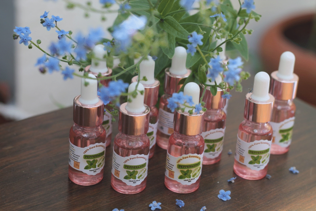 Il est possible de rajouter d’autres huiles essentielles à celle de la menthe poivrée en diffusion : l’huile essentielle d’eucalyptus et huile essentielle de ravintsara.