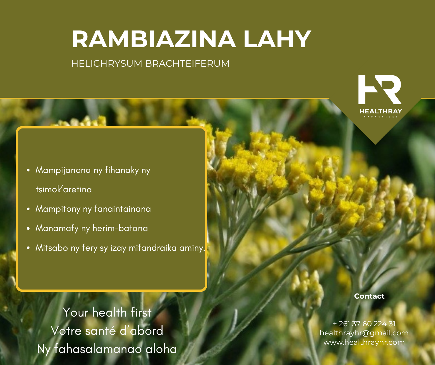 L’Helichrysum Bracteiferum, connu sous le nom d’Helichryse mâle, est une plante à l’odeur forte et camphrée. Plante endémique à Madagascar, elle pousse dans les régions montagneuses, en particulier sur les sols rocheux et dans les forêts de lichens. Cette plante est reconnue pour sa forte concentration en cinéole et est principalement utilisée dans la phytothérapie malgache pour traiter les affections respiratoires.