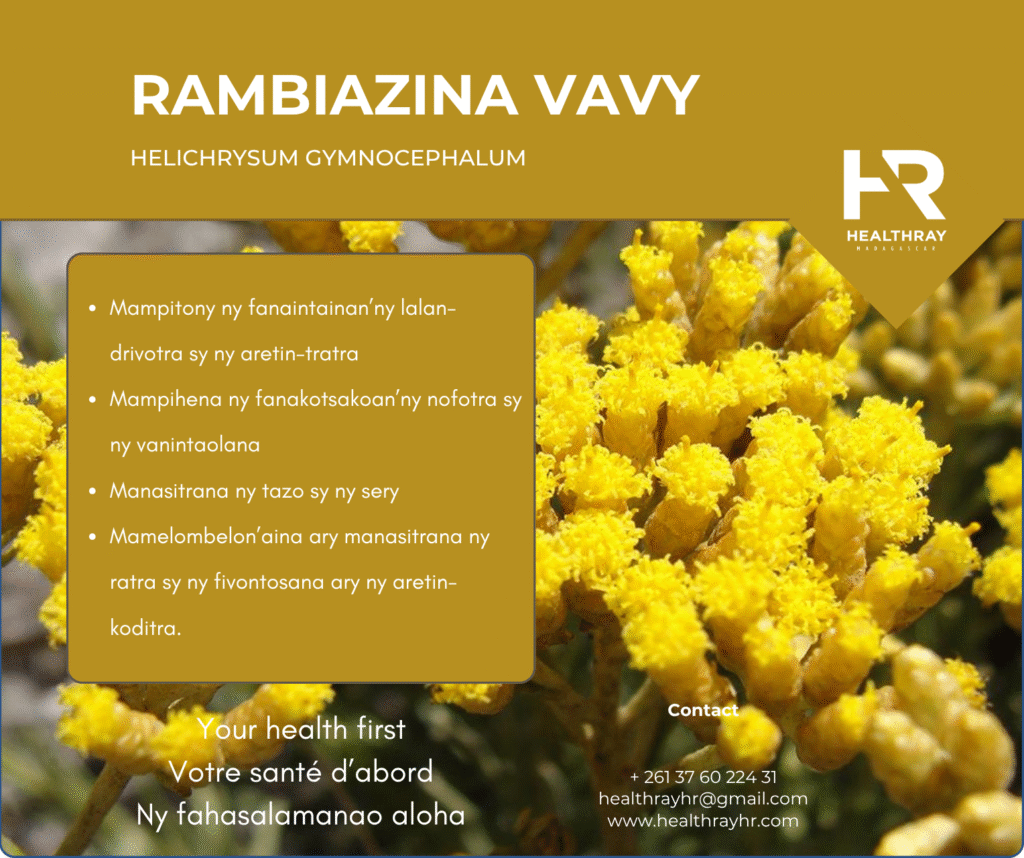 L’hélichryse gymnocéphalulm, une plante endémique de Madagascar, est reconnue pour ses propriétés médicinales, notamment dans le domaine des voies respiratoires et du système nerveux. Son huile essentielle est prisée pour ses effets antiviraux, antibactériens, anti-inflammatoires et antiseptiques. Elle est également réputée pour son action sur la sphère respiratoire, aidant à dégager les bronches et à soutenir les défenses naturelles.